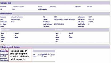 A continuación le aparecerá una ventana en la cual usted tendrá la información básica del aviso de liquidación seleccionado. Si desea ver el detalle de la información de las facturas, notas débito y notas crédito asociadas a su liquidación, seleccione la opción Detalledel Aviso de Liquidacióndando click en el signo + ubicado a la izquierda de la opción.