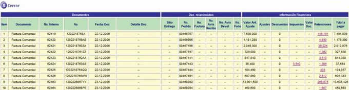 Una vez seleccionada la opción “Detalle del Aviso de Liquidación”, se desplegará toda la información del pago incluyendo facturas y notas con sus respectivos ajustes e impuestos. Así: