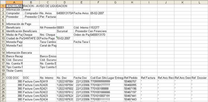 La opción Plano Estructuradopermite descargar el Aviso de liquidación seleccionado en un archivo plano simple separado por comas que facilita la integración con el sistema de información de su empresa.