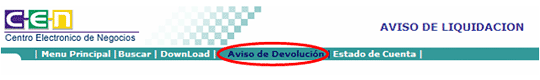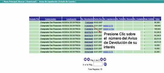 A continuación  visualizará una tabla resumen de las devoluciones efectuadas según los  criterios de búsqueda seleccionados. Para acceder a la información de cada  Aviso de Devolución elija el número de Aviso de su interés. Si desea puede  hacer descarga de esta información en Excel, dando click sobre la opción Download ubicada  en el menú.