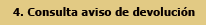 Cuando ingrese  al Aviso de Devolución por las opciones 2 y 3, encontrará 4 criterios de  consulta: Comerciante,  Número de documento, Referencia, Fecha y Periodo.
