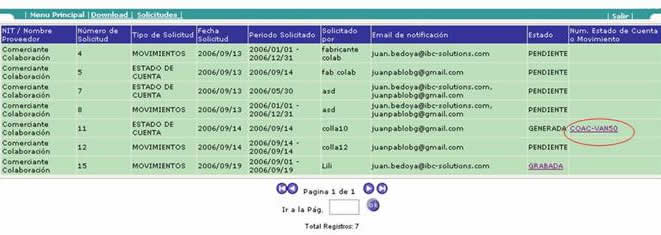 Generada: Indica que la solicitud ya fue procesada por el cliente y que el documento se encuentra disponible en el CEN Financiero. Para consultarlo haga click sobre el link del “Número del Estado de Cuenta”. (Usted podrá visualizar el documento en Web y descargado en Excel).